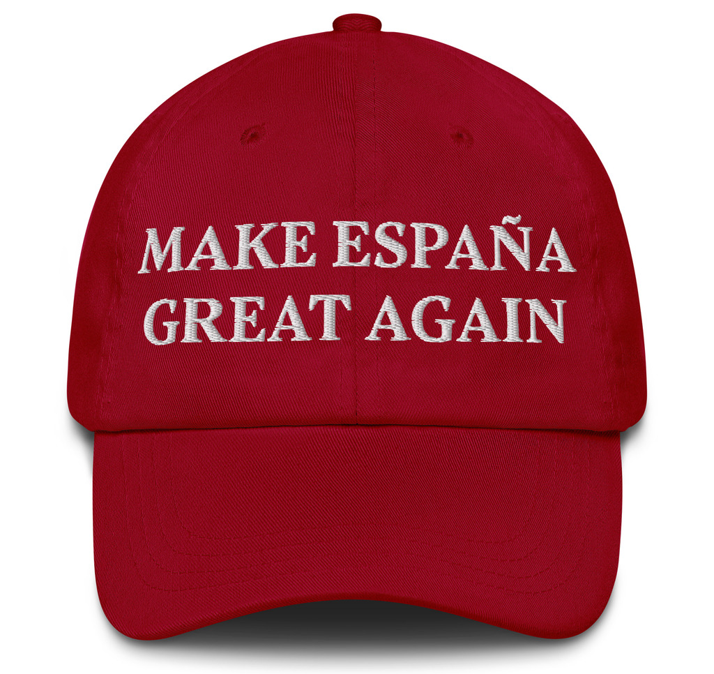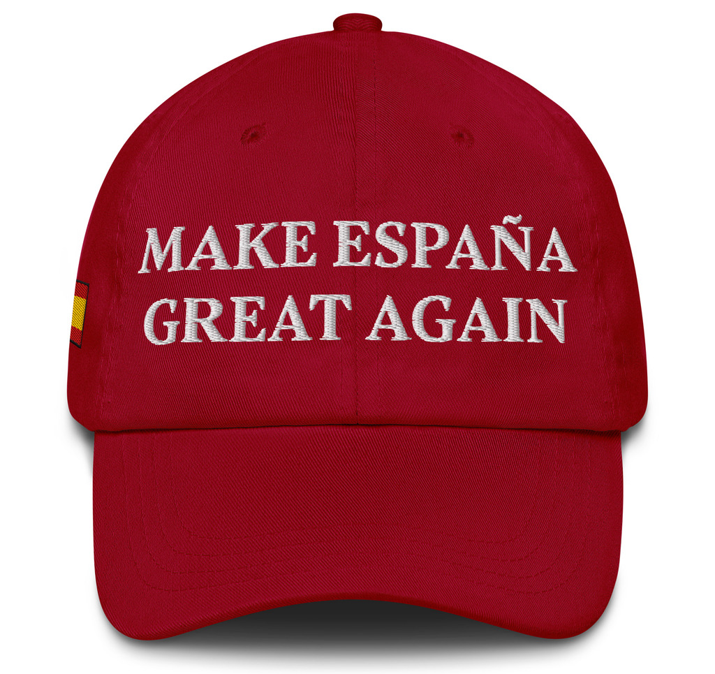 Gorra "Make España Great Again" en color rojo sin bandera. Letra blanca bordada. El clásico de nuestras gorras.