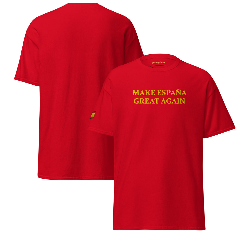 Nuestra camiseta clásica "Make España Great Again" en color rojo con la bandera de España y letras bordadas en color amarillo gualdo.