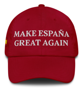 Gorra "Make España Great Again" en color rojo sin bandera. Letra blanca bordada. El clásico de nuestras gorras.