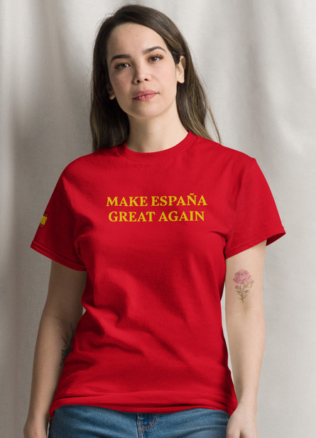 Nuestra camiseta clásica "Make España Great Again" en color rojo con la bandera de España y letras bordadas en color amarillo gualdo.